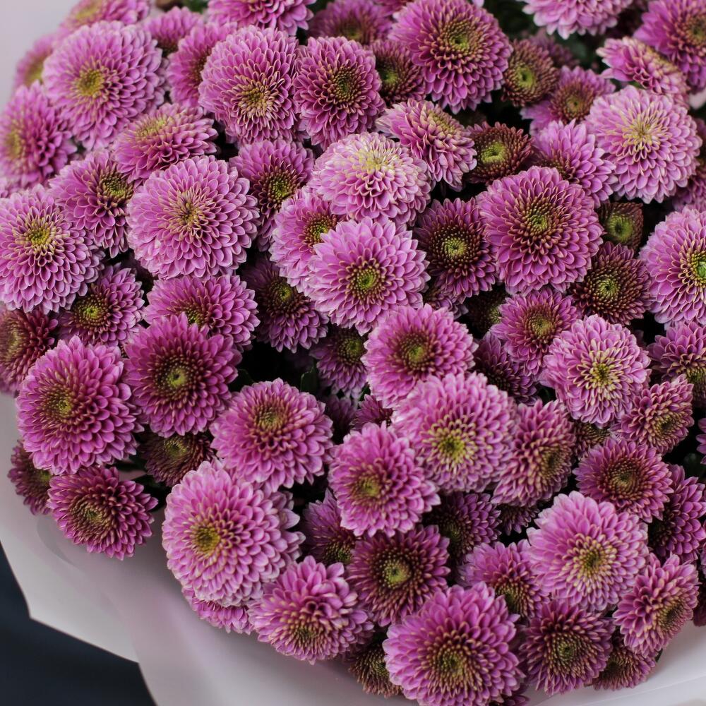 Воздушные хризантемы Сантини в стильной упаковке. Хризантема является рекордсменом по стойкости в вазе, букет из хризантем будет радовать получателя более 14 дней.